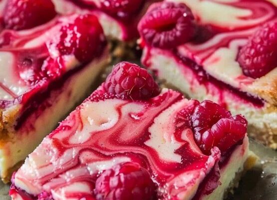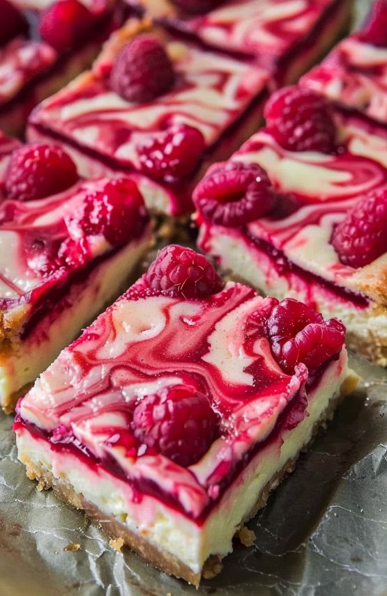 - In a separate bowl, beat the softened cream cheese with the sugar until smooth. Add the egg and mix until well combined. Gently fold in the raspberry puree, creating a marbled effect.
