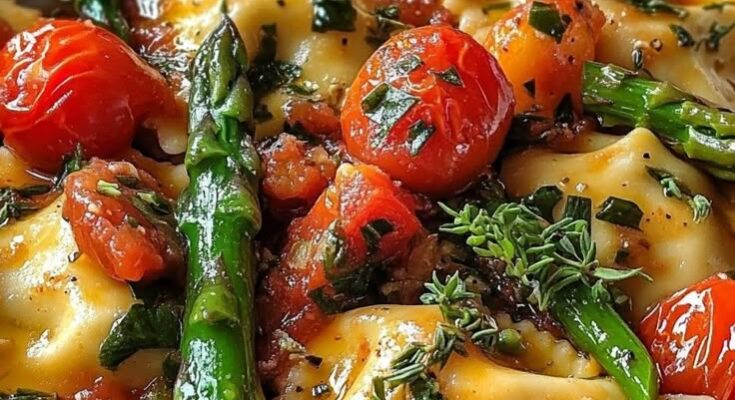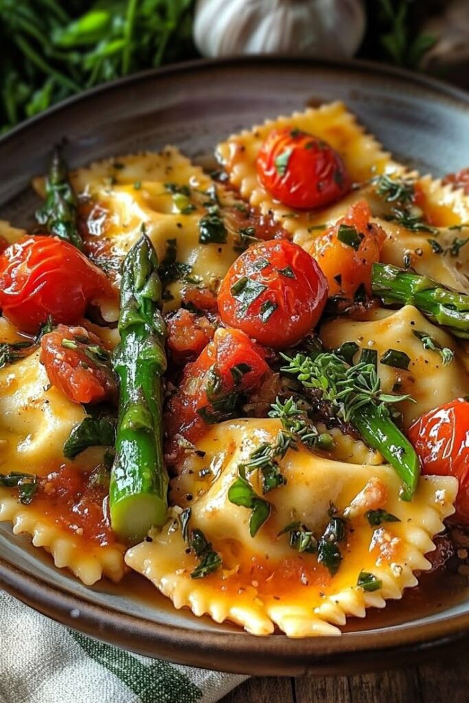 Ravioli with Tomatoes, Asparagus, Garlic, and Herbs