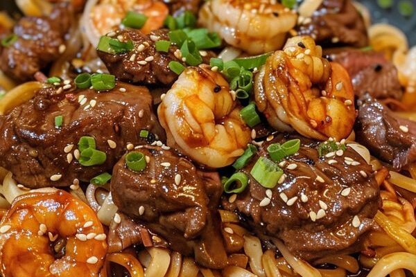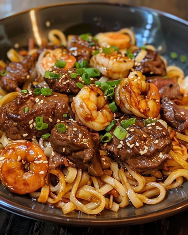 A flavorful mix of tender steak, juicy shrimp, and chewy noodles tossed in a savory sauce!