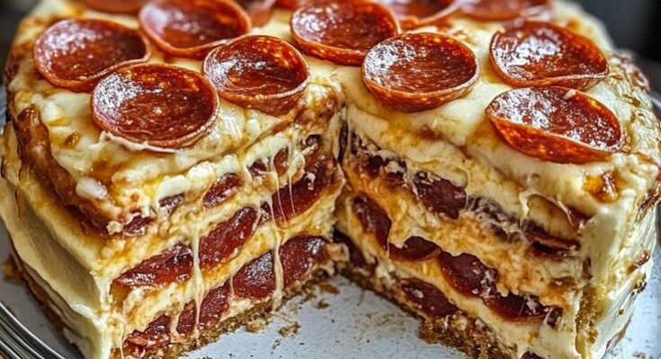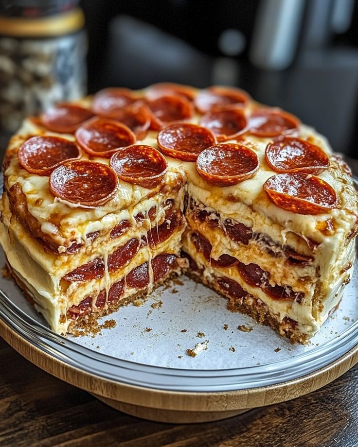 Assemble the pizza: Preheat your oven to 375°F (190°C). Grease a deep dish pizza pan with olive oil. Roll out the dough into a large circle and fit it into the pan, making sure to press it up the sides. Add a layer of cheese at the bottom, followed by a layer of cooked ground beef, then add some pepperoni and spoon over the pizza sauce. Repeat the layers, ending with a generous layer of mozzarella cheese.